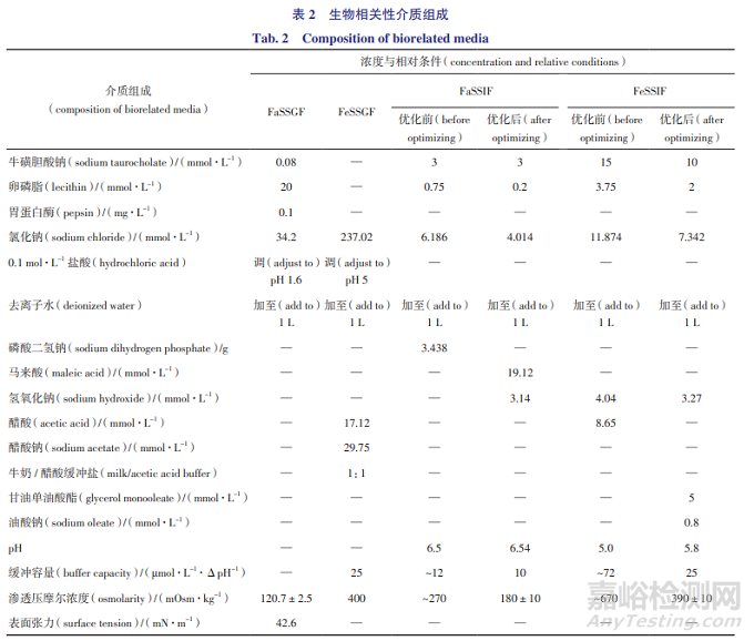 目前模擬空腹?fàn)顟B(tài)下胃液(fast state simulated gastric fluid,F(xiàn)aSSGF)、進(jìn)食狀態(tài)下胃液(fed state simulated gastric fluid,F(xiàn)eSSGF)、空腹?fàn)顟B(tài)下腸液(fast state simulated intestine fluid,F(xiàn)aSSIF)和進(jìn)食狀態(tài)下腸液(fed state simulated intestine fluid,F(xiàn)eSSIF)的溶出介質(zhì)的主要組成如表2所示。