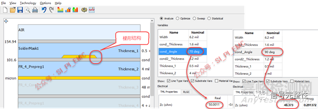這個梯形的角度會隨著銅厚的變化而變化(鍍銅亦是如此),厚度越薄,角度越接近90°。這個角度的大小會影響到阻抗的大小。如下圖所示為90°與70°結(jié)果的對比: