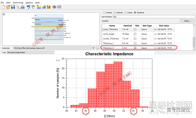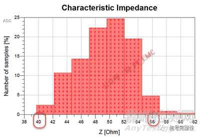 從結(jié)果上分析,阻抗變化分布在44ohm到54ohm之間。阻抗變化的范圍達(dá)到了10ohm之多。