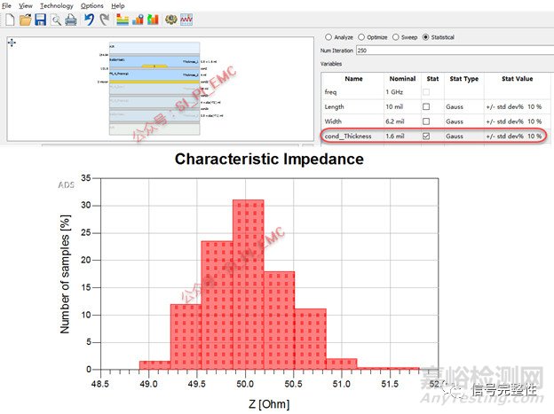 從結(jié)果分析來看,阻抗主要在49.5到51ohm之間變化。相對于線寬而言,變化區(qū)間會小不少。