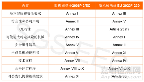 新機(jī)械法規(guī)重新對(duì)附錄內(nèi)容進(jìn)行了排序編寫,與舊指令的附錄內(nèi)容對(duì)比如下: