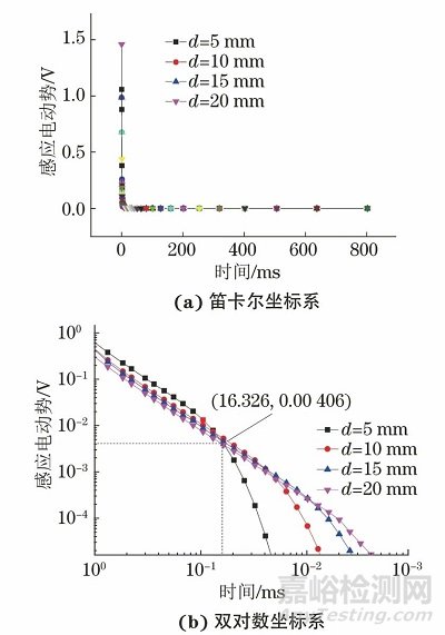 針對(duì)不同厚度的試件展開試驗(yàn),分析不同壁厚對(duì)信號(hào)的影響。設(shè)置激勵(lì)電流為1 A,激發(fā)頻率為1/4 Hz,試件距離傳感器垂直高度為100 mm。對(duì)試驗(yàn)數(shù)據(jù)進(jìn)行坐標(biāo)變換,將笛卡爾坐標(biāo)系變換成雙對(duì)數(shù)坐標(biāo)系后,可明顯看出檢測(cè)信號(hào)在t<16.326 ms時(shí)數(shù)據(jù)重合,在t>16.326 ms時(shí)出現(xiàn)了明顯的分叉,如圖4所示。檢測(cè)結(jié)果表明電磁法檢測(cè)金屬管道缺陷具有可行性。
