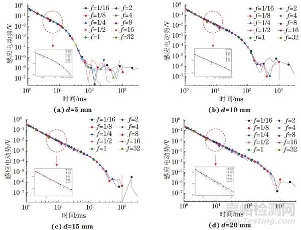 試驗(yàn)采用的激勵(lì)信號(hào)為階躍型電流信號(hào),設(shè)備集激發(fā)和采集于一體。選擇激勵(lì)頻率為1/16,1/8,1/4,1/2,1,2,4,8,16 Hz,分析各厚度試件在不同頻率下的電磁檢測(cè)信號(hào),試驗(yàn)結(jié)果如圖5所示。
