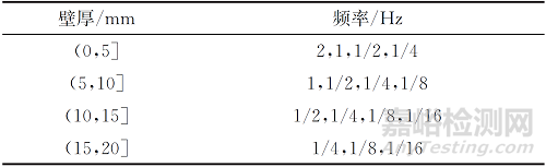 為了確保接收信號(hào)的完整性,必須根據(jù)管道壁厚設(shè)置合適的激發(fā)頻率。分析可知對(duì)于壁厚較大的管道應(yīng)該選擇較小的激發(fā)頻率(更有穿透力);對(duì)于壁厚較小的管道應(yīng)該選擇較大的激發(fā)頻率,確保信號(hào)的有效性。在試驗(yàn)過(guò)程中發(fā)現(xiàn)頻率小會(huì)延長(zhǎng)數(shù)據(jù)采集時(shí)間且給后期數(shù)據(jù)帶來(lái)較大干擾。為了提高實(shí)際檢測(cè)工作效率,按照不同管道壁厚對(duì)激發(fā)頻率進(jìn)行優(yōu)化,優(yōu)化結(jié)果如下: