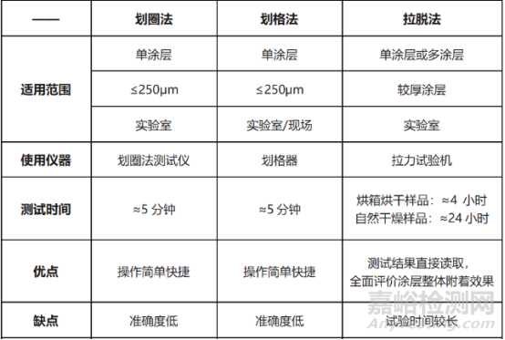拉開法適用于較厚涂層,單涂層和多涂層體系,測(cè)定涂層之間的附著力時(shí),可優(yōu)先選用該方法。拉開法屬于直接測(cè)定法,能用數(shù)值表示涂層附著力,可用于研究涂料配方是否合理及全面評(píng)價(jià)涂層整體附著效果。此法較為復(fù)雜,且須等膠黏劑完全固化后才能進(jìn)行試驗(yàn),試驗(yàn)時(shí)間較長(zhǎng)。
