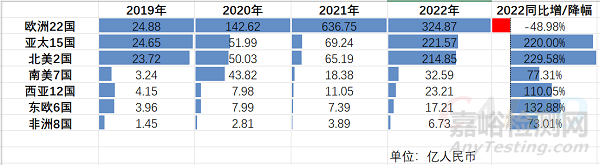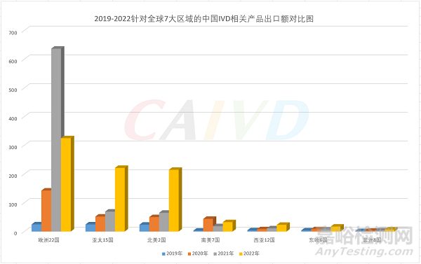 2019-2022 針對(duì)全球7大區(qū)域的中國(guó)IVD相關(guān)產(chǎn)品出口額對(duì)比圖↑