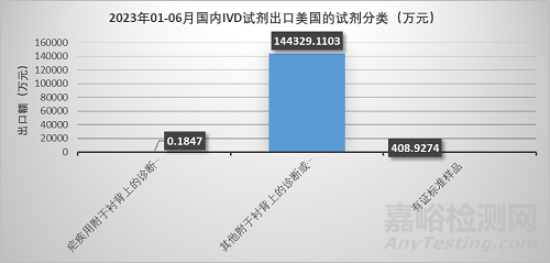 出口美國(guó)的主要分為3類,其中其他附于襯背上的診斷或?qū)嶒?yàn)用試劑及不論是否附于襯背上的配制試劑占比約100%。