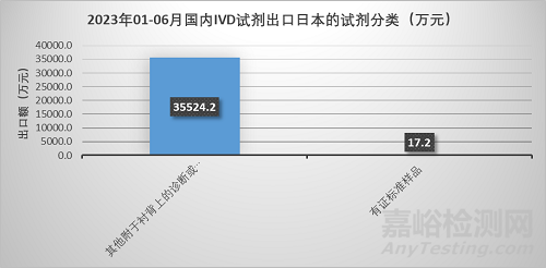 出口日本的主要分為2類,其中其他附于襯背上的診斷或?qū)嶒?yàn)用試劑及不論是否附于襯背上的配制試劑占比約100%。