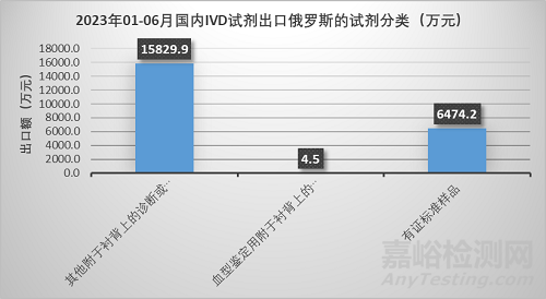 出口俄羅斯的主要分為3類,其中其他附于襯背上的診斷或?qū)嶒?yàn)用試劑及不論是否附于襯背上的配制試劑占比約71%,有證標(biāo)準(zhǔn)樣品約占29%。