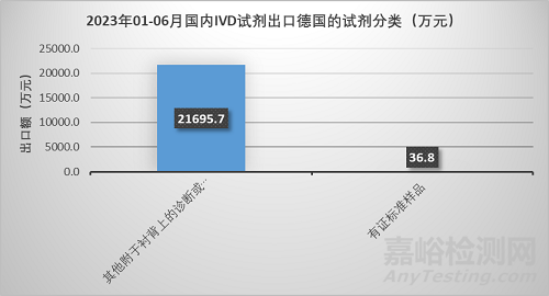 出口德國(guó)的主要分為2類,其中其他附于襯背上的診斷或?qū)嶒?yàn)用試劑及不論是否附于襯背上的配制試劑占比約100%。