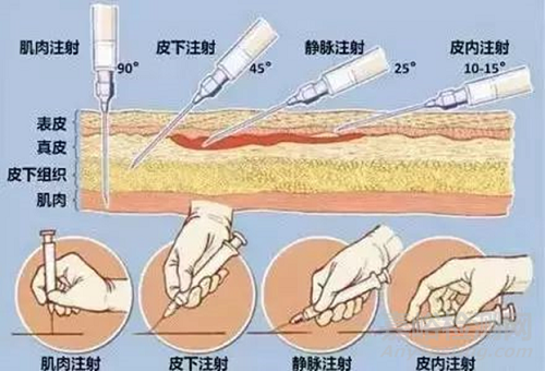 (3)皮內(nèi)注射(intra-cutaneous, IC;intra-dermal,ID):把藥物注射到皮膚的表皮和真皮之間,注射劑量約0.1-0.2mL