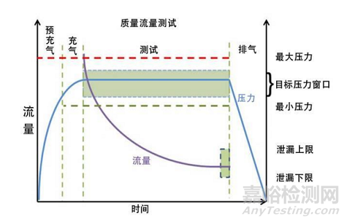 流量測試通過測量流過的物體的質(zhì)量流量值大小來實現(xiàn)無損泄漏檢測。當氣源對被測件充氣完畢后,如果被測件有泄漏,整個密封系統(tǒng)就會有氣體的流動,泄漏值與流量相同,用微小流量傳感器測出泄漏量。
