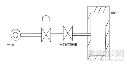 壓力衰減,顧名思義我們要通過測量減少了多少壓力來判斷泄漏了多少。所以我們需要先充個氣,再把充氣口關掉密封起來,接下來在泄漏的過程中用一個壓力傳感器來測量壓力少了多少。把以上的過程連起來就組成了下面的氣路圖。