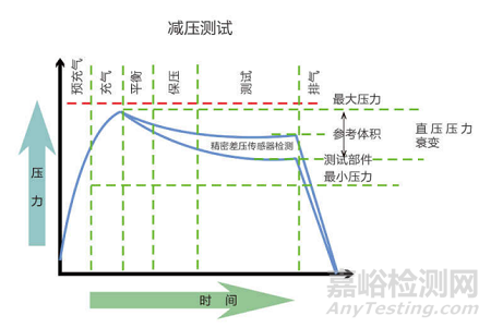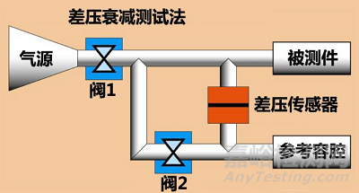 采用直壓相同的壓力設置參數(shù),通過差壓傳感器測量參考體積空氣壓力和測試部件體積之間的壓力變化來判定泄漏率。在差壓衰減測試中,測試出的泄漏值為參考體積和部件體積之間的壓力損失率,它快速、可靠、靈敏,足以檢測出微小的泄漏值。