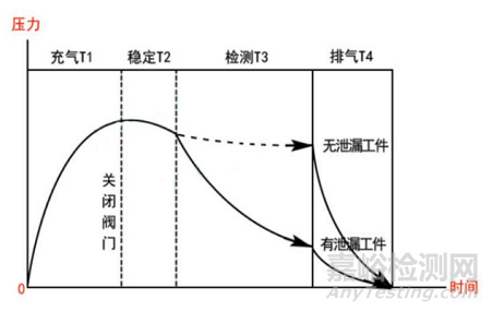測試過程: 充氣、穩(wěn)定、檢測、排氣4個階段。如圖首先把閥打開,給待測試工件充氣。等氣充好了,把閥關上,可以看到壓力開始減少。閥剛關閉的時候壓力波動較大,所以需要等待一些時間讓內(nèi)部壓力穩(wěn)定一下。之后隨著泄漏壓力開始穩(wěn)定下降,測量在固定的時間段內(nèi)壓力衰減,簡單一點我們叫它壓降(壓損),我們就知道了這個被測件漏了多少。測試過程: 充氣、穩(wěn)定、檢測、排氣4個階段。