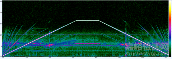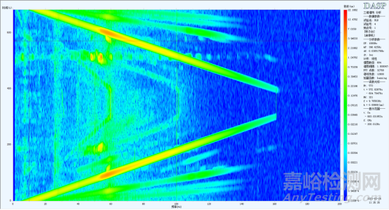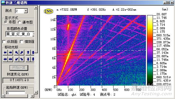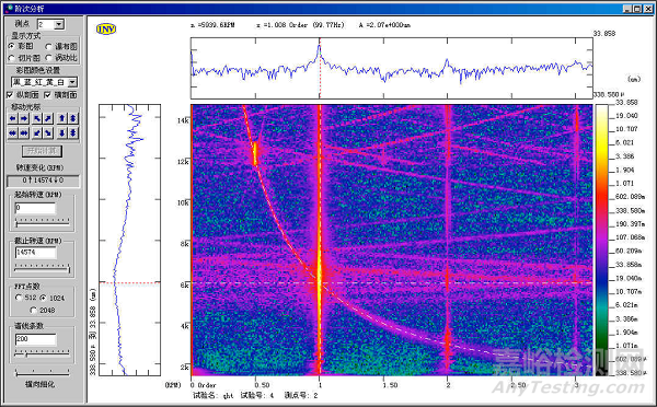 圖為對振動位移信號進(jìn)行時間三維譜振分析后得到的三維彩圖,在圖中可看到繪制的階次轉(zhuǎn)頻曲線。