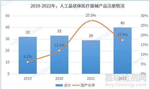 從產(chǎn)品注冊(cè)情況來看,2019-2022年注冊(cè)數(shù)量總體呈上升趨勢(shì),四年國(guó)產(chǎn)占比率在15.8%左右,其中有效期內(nèi)首次注冊(cè)人工晶狀體醫(yī)療器械占19.3%。
