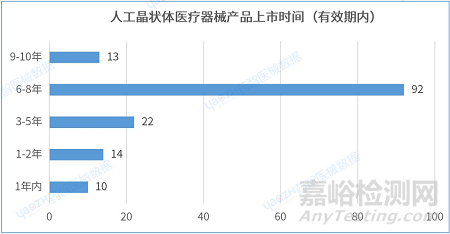 據(jù)統(tǒng)計(jì),從產(chǎn)品進(jìn)入市場(chǎng)的平均時(shí)間來看,在有效期內(nèi)的人工晶狀體醫(yī)療器械產(chǎn)品的上市時(shí)間在6-8年的產(chǎn)品數(shù)量最多,有92件。