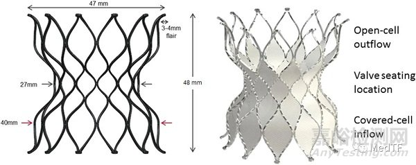 ALTERRA由自膨脹、不透射線(xiàn)的鎳鈦合金支架和聚對(duì)苯二甲酸乙二醇酯(PET)織物組成,并具有指定的流入和流出端。流入部分可通過(guò)兩個(gè)三角形凸耳的存在進(jìn)行識(shí)別,這兩個(gè)凸耳連接到輸送系統(tǒng)和所有單元的周向織物上。PET織物通過(guò)縫線(xiàn)連接到支架的內(nèi)表面,在流入部分形成密封。ALTERRA采用對(duì)稱(chēng)支架設(shè)計(jì),流入和流出直徑為40 mm,中心部分為27 mm,為SAPIEN 3 (29 mm)提供剛性“著陸區(qū)”。雖然無(wú)約束ALTERRA的總長(zhǎng)度為48 mm,但由于流出端無(wú)織物導(dǎo)致完全覆蓋的長(zhǎng)度僅為30 mm。