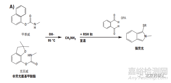 甲奈威和克百威屬于氨基甲酸酯一類的廣譜殺蟲劑,常用于水稻和玉米作物,其本身無熒光,通過高溫堿性條件下,將其水解為甲基胺,再與鄰苯二甲醛(OPA) 和2-巰基乙醇(RSH) 反應,生成具有強熒光性的異吲哚衍生物,可用于熒光檢測,檢測級別可到達ppt級別。