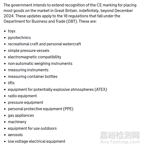 Landlink在接到消息后第一時間前往英國官網(wǎng)進行嚴(yán)謹(jǐn)?shù)男畔⑺鸭c查證,英國官方的新聞稿明確指出了本次涉及CE標(biāo)志無限期使用的領(lǐng)域,包含商業(yè)和貿(mào)易部(DBT)下玩具、機械、測量儀器等18個領(lǐng)域,具體內(nèi)容如下: