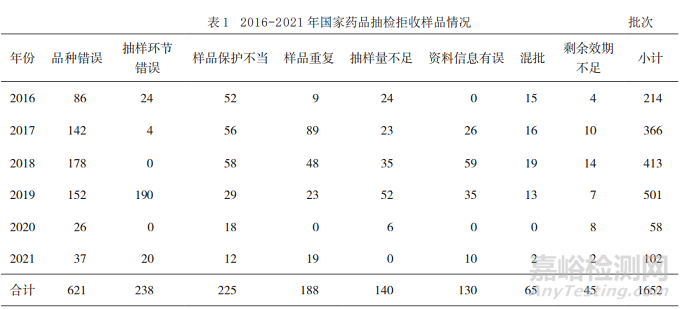 國家藥品抽檢是面向全國各地區(qū)的生產、經營和使用環(huán)節(jié)的抽檢,層級高、規(guī)模大、覆蓋面廣和代表性強。因此,本文以2016-2021年共6年的國家藥品抽檢抽樣工作中出現的問題為樣本,對抽樣中的常見問題進行分析。