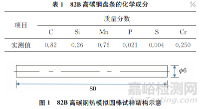 試驗(yàn)材料為某單位生產(chǎn)的82B高碳鋼盤條,其化學(xué)成分如表1所示。將試樣進(jìn)行后續(xù)精加工,制成規(guī)格(直徑×長度)為6mm×80mm的熱模擬圓棒試樣,其結(jié)構(gòu)如圖1所示。