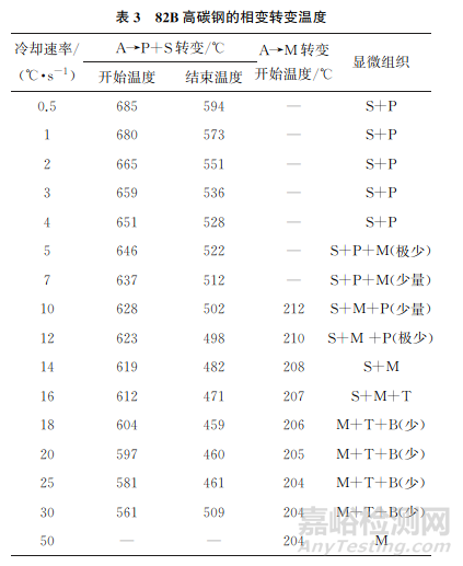 (2)冷卻速率在0.5~4℃/s時,82B高碳鋼的組織轉(zhuǎn)變?yōu)橹楣怏w和索氏體;冷卻速率為5℃/s時,開始出現(xiàn)馬氏體;當(dāng)冷卻速率為5~30℃/s時,馬氏體逐漸增多,珠光體和索氏體逐漸減少;當(dāng)冷卻速率達(dá)到50℃/s時,其組織為馬氏體。82B高碳鋼的最佳冷卻速率應(yīng)該控制在5℃/s以內(nèi),以避免產(chǎn)生馬氏體組織,從而得到適量的珠光體和索氏體組織,以提高82B高碳鋼的整體性能。