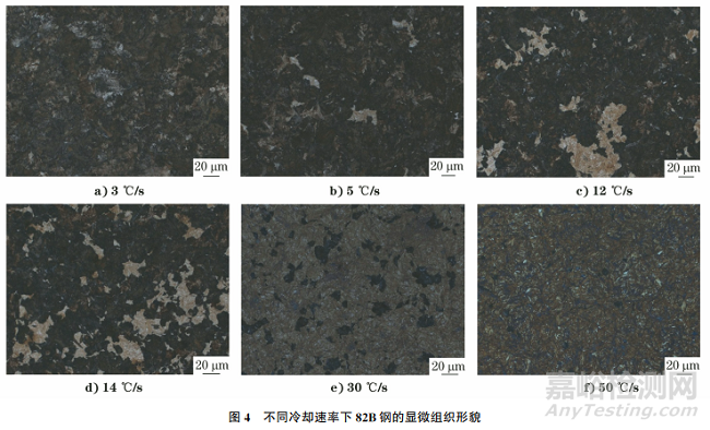 將熱模擬試樣沿著熱電偶焊接處橫向切開,經(jīng)過磨制、拋光后,用4%(體積分?jǐn)?shù))的硝酸乙醇溶液進(jìn)行試樣的腐蝕,觀察試樣橫截面的顯微組織,圖4為不同冷卻速率下82B高碳鋼的顯微組織形貌。