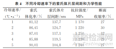 圖5為1~5℃/s冷卻速率下82B高碳鋼的SEM形貌,從圖5可以看出:隨著冷卻速率的增加,索氏體平均片層間距逐漸減小,且變得均勻細(xì)密。不同冷卻速率下的索氏體片層間距和力學(xué)性能如表4所示,可知在冷卻速率為5℃/s時索氏體片層間距最小。