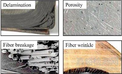 碳纖維復(fù)合材料具有高強度、高模量、良好的抗疲勞性能和抗腐蝕性能等,被廣泛應(yīng)用于航空、航天、汽車工業(yè)等領(lǐng)域。然而,由于碳纖維復(fù)合材料在制作工藝過程中的不穩(wěn)定性與服役時易受載荷和復(fù)雜環(huán)境的影響,不可避免地產(chǎn)生分層、孔隙、纖維斷裂、纖維屈曲等損傷,如圖1所示。這些損傷將嚴重地影響碳纖維復(fù)合材料層合板的力學(xué)性能。