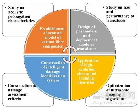 超聲無損檢測技術(shù)因其檢測設(shè)備便攜、無污染危害以及檢測效率高等優(yōu)點,是目前檢測復(fù)合材料損傷最為實用、有效的技術(shù)手段之一。然而,因碳纖維復(fù)合材料的各向異性和層狀結(jié)構(gòu)的影響,增加了超聲檢測技術(shù)檢測復(fù)合材料層狀結(jié)構(gòu)中損傷的難度。如圖2所示,利用超聲檢測技術(shù)圍繞四個環(huán)節(jié)實現(xiàn)碳纖維復(fù)合材料中損傷的檢測與成像:
