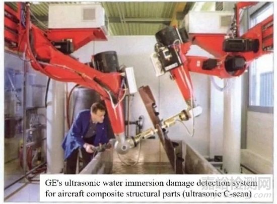 C掃描檢測技術(shù)能夠?qū)崿F(xiàn)碳纖維復(fù)合材料大面積的損傷成像。圖8為GE公司用于大型復(fù)合材料結(jié)構(gòu)損傷檢測的超聲波水浸C掃描探傷系統(tǒng),該技術(shù)具有顯示直觀和檢測速度快的特點。