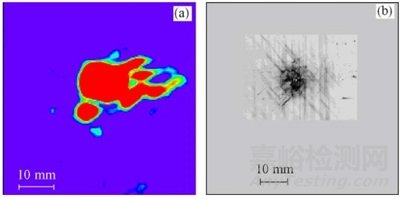 圖9 檢測復(fù)合材料中的沖擊損傷:(a) 超聲波C掃描技術(shù);(b) X射線技術(shù)