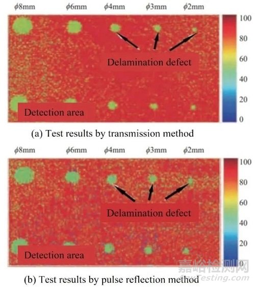 在國內(nèi),Sun等采用激光激勵與激光接收的檢測方式,基于自研的激光超聲檢測系統(tǒng),實現(xiàn)了復(fù)合材料的分層損傷的檢測。郭佳等同樣基于激光激勵與激光接收的檢測方式,分別采用了脈沖反射法和穿透法,對碳纖維復(fù)合材料中不同大小的圓形損傷損傷進行檢測,如圖10所示,結(jié)果表明激光超聲檢測技術(shù)能夠檢測出直徑為2 mm的圓形損傷。劉松平等采用激光激勵縱波與超聲換能器接收信號的檢測方式,研究了復(fù)合材料中常見損傷的激光超聲信號特征與損傷識別評估方法。隨著幾十年的發(fā)展,國內(nèi)激光超聲技術(shù)在激勵、接收、理論和技術(shù)等方面取得了極大進步。