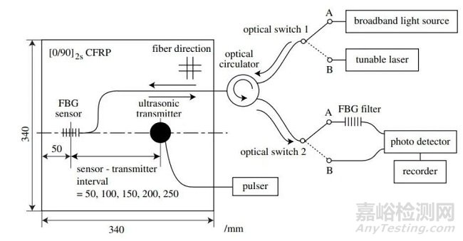 光纖超聲檢測技術(shù)的基本原理是利用超聲波與光纖之間的相互作用引起的光纖傳輸?shù)墓獾膹姸?、相位、波長、偏振狀態(tài)等的改變,從而獲取被測物體內(nèi)部的信息。圖11為一種典型的光纖超聲檢測系統(tǒng),在該系統(tǒng)中由壓電陶瓷超聲換能器激發(fā)出導(dǎo)波,利用光纖光柵接收導(dǎo)波信號。研究表明,對比于激發(fā)出的對稱模態(tài)波和反對稱模態(tài)波,光纖換能器對于對稱模態(tài)波更敏感。因此,Tsuda等利用激發(fā)出的對稱模態(tài)波檢測正交碳纖維復(fù)合材料中的沖擊損傷,通過比較壓電陶瓷和光纖換能器的接收信號響應(yīng),表明光纖換能器對信號響應(yīng)的靈敏度更高,比傳統(tǒng)的壓電換能器更適合于超聲導(dǎo)波的檢測。
