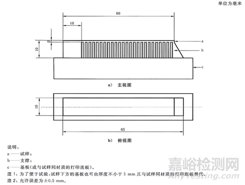 指尺寸和翹曲變形試樣,用于3D打印的精度和翹曲變形量的測量,詳見YY/T 1702-2020《牙科學(xué) 增材制造 口腔固定和活動修復(fù)用激光選區(qū)熔化金屬材料》中7.3.2項描述。采用厚度為1mm的單邊懸臂梁試樣,按下圖尺寸制備。