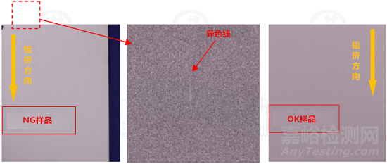 2.經(jīng)研磨并拋光后,NG樣品基材表面可見AlFeSi顆粒分布稀少的條帶,其寬度與異色線區(qū)域?qū)挾认喾唤鹣喔g后,拋光態(tài)所見條帶變得更加明顯,NG樣品與OK樣品基材晶粒大小差異較小;推測產(chǎn)品表面異色線缺陷應(yīng)為基材組織異常造成。