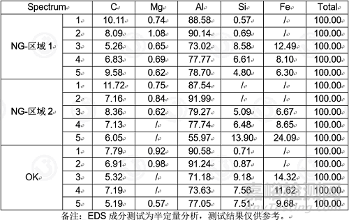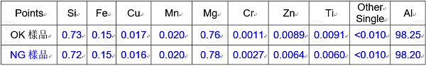 采用火花原子光譜儀對其基材進(jìn)行化學(xué)成分分析,結(jié)果見表1;NG樣品與OK樣品基材化學(xué)成分均為6系鋁合金,兩者差異較小。