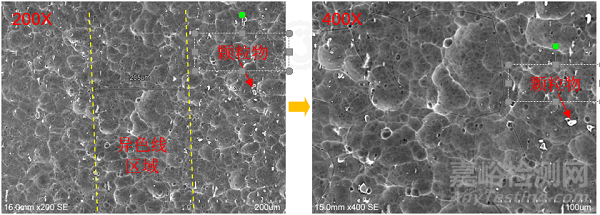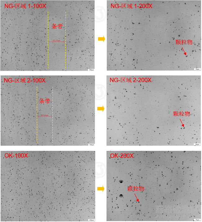 1.研磨拋光后,在NG樣品區(qū)域1和區(qū)域2均可見條帶存在,條帶區(qū)域顆粒物較少,而其兩側(cè)顆粒物較多,條帶寬度與SEM所觀察異色線寬度相符;