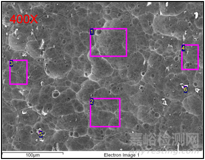 對退鍍NG樣品缺陷區(qū)域進(jìn)行SEM觀察及EDS成分分析,結(jié)果見圖2~3及表2,可見: