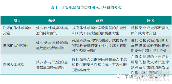 計算機(jī)建模與仿真技術(shù)對監(jiān)管科學(xué)到底意味著什么?簡而言之就是計算機(jī)模型生成的數(shù)字化證據(jù),可以作為監(jiān)管證據(jù),來減少、改善、替代傳統(tǒng)上通過體外、動物或人體試驗生成的證據(jù)(表1)[12]。監(jiān)管科學(xué)需要形成評價數(shù)字化證據(jù)的標(biāo)準(zhǔn)體系,從而使技術(shù)驅(qū)動的可持續(xù)和安全的制藥業(yè)成為可能。