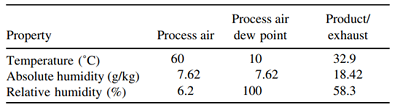 表1所示的示例說(shuō)明濕法制粒后流化干燥過(guò)程,將濕顆粒干燥成干顆粒。環(huán)境空氣被吸入進(jìn)風(fēng)空氣處理單元被除濕至露點(diǎn)溫度為10?C(每千克干燥空氣7.6克水)。然后把進(jìn)風(fēng)溫度加熱到60?C,這將使其相對(duì)濕度降至6%左右。包衣過(guò)程中工藝空氣交換熱量,具有較高溫度的空氣流將包衣液中的溶劑蒸發(fā)并帶走。出風(fēng)溫度降至26℃左右的相對(duì)濕度基本上是飽和的,大約99%,此時(shí)出風(fēng)時(shí)每公斤干燥空氣含有21.2g水,水分去除率為13.6g每公斤干燥空氣。雖然這個(gè)例子忽略了過(guò)程風(fēng)量,但一公斤的空氣將除去13.6克的水。一立方米空氣重約1.0kg。工藝風(fēng)量為5000 m3 /hr,在這些綜合參數(shù)條件下空氣可以在1小時(shí)內(nèi)除去約68kg的水。