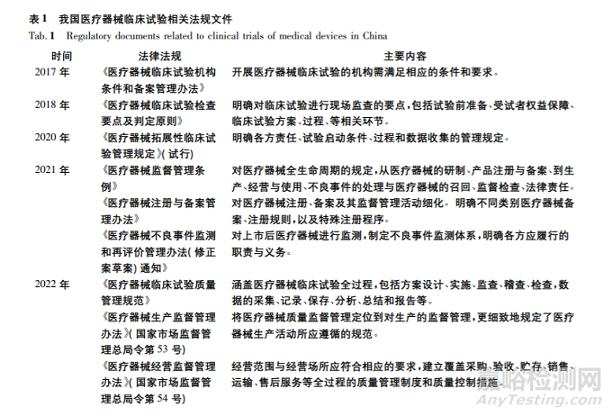 醫(yī)療器械臨床試驗(yàn),是指在符合條件的醫(yī)療器械臨床試驗(yàn)機(jī)構(gòu)中,對(duì)擬申請(qǐng)注冊(cè)的醫(yī)療器械在正常使用條件下的安全性和有效性進(jìn)行確認(rèn)的過程,其質(zhì)量影響對(duì)醫(yī)療器械安全性和有效性的評(píng)價(jià)。因此,臨床試驗(yàn)的質(zhì)量管理顯得尤為重要。2014年原國家食品藥品監(jiān)督管理總局發(fā)布了《體外診斷試劑臨床試驗(yàn)技術(shù)指導(dǎo)原則》,以指導(dǎo)體外診斷試劑臨床試驗(yàn)工作。2016 年,總局發(fā)布了《醫(yī)療器械臨床試驗(yàn)質(zhì)量管理規(guī)范》 ( 以下簡稱:《規(guī)范》) ,明確各方職責(zé),加強(qiáng)監(jiān)督監(jiān)查,將《規(guī)范》中的要求落實(shí)到各個(gè)環(huán)節(jié)。2018 年,國家藥監(jiān)局組織制定了《醫(yī)療器械臨床試驗(yàn)檢查要點(diǎn)及判定原則》用于指導(dǎo)醫(yī)療器械臨床試驗(yàn)現(xiàn)場檢查工作。醫(yī)療器械的發(fā)展離不開政策法規(guī)的支持,為了規(guī)范臨床試驗(yàn)操作,保障人民的用械安全,我國在不斷修改完善醫(yī)療器械相關(guān)法規(guī)( 表1) 。