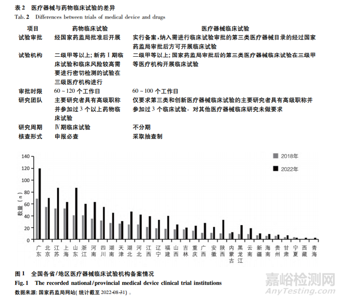 國內(nèi)醫(yī)療器械臨床試驗(yàn)機(jī)構(gòu)的分布情況醫(yī)療器械臨床試驗(yàn)最早是參照藥物臨床試驗(yàn)規(guī)范進(jìn)行,在 2018 年之前大多數(shù)的醫(yī)療器械臨床試驗(yàn)是依托藥物臨床試驗(yàn)機(jī)構(gòu)完成的。然而醫(yī)療器械臨床試驗(yàn)和藥物臨床試驗(yàn)在試驗(yàn)審批、試驗(yàn)周期、風(fēng)險(xiǎn)管理和研究人員資質(zhì)等方面都存在很大差異,詳見表 2。雖然醫(yī)療器械和藥物臨床試驗(yàn)都遵循藥物臨床試驗(yàn)管理規(guī)范( good clinical practice,GCP) ,但由于醫(yī)療器械具有一定的特殊性,具體的標(biāo)準(zhǔn)操作規(guī)程 ( standard operatingprocedures,SOP) ,仍需要在大量的試驗(yàn)中探索。因此,為了更好地滿足醫(yī)療器械臨床試驗(yàn)的需求,原國家食品藥品監(jiān)督管理總局于 2017 年發(fā)布《醫(yī)療器械臨床試驗(yàn)機(jī)構(gòu)條件和備案管理辦
