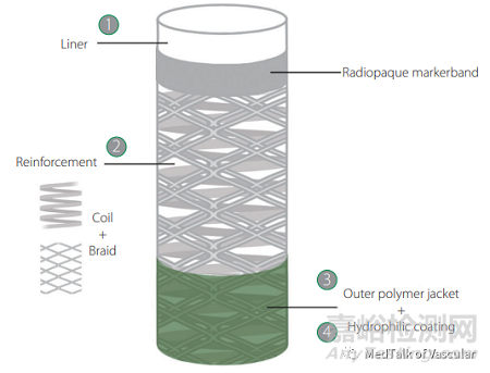目前,臨床使用的顱內(nèi)血栓抽吸導(dǎo)管由內(nèi)到外的結(jié)構(gòu)普遍是四層設(shè)計,分別為PTFE Liner內(nèi)層→中間金屬層→高分子外層→外層表面親水涂層;如下圖所示: