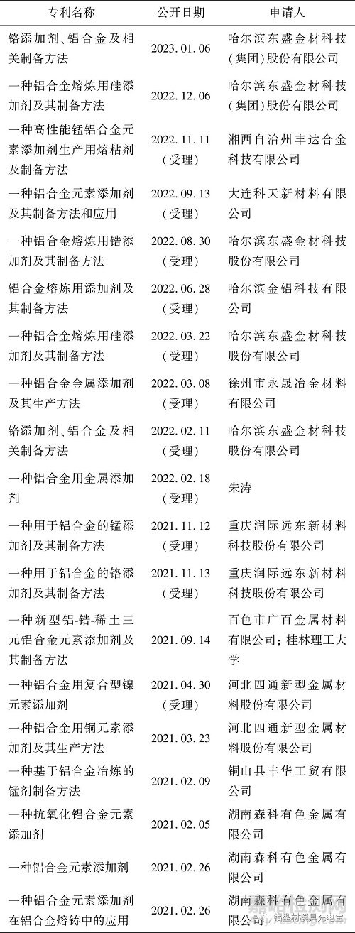 表3 2021~2023年鋁合金元素添加劑相關(guān)發(fā)明專利