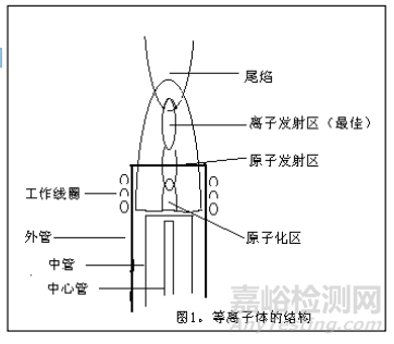 等離子體是 ICP-AES 的核心之一,其結(jié)構(gòu)如圖所示,工作線圈(Work coil)通以高頻(27.12MHz/40.68 MHz)、大功率的能量,在石英炬管(Torch)中形成強(qiáng)交變電磁場,使其中之氬氣(Ar)電離,形成一個(gè)穩(wěn)定的、高溫放電炬——等離子體(Plasma)。樣品的氣溶膠通過中心管噴入等離子體中形成一個(gè)Φ2mm 左右的分析通道。由于等離子體不同區(qū)域存在不同的溫度分布,整個(gè)分析通道分為:原子化區(qū)(溫度較低)、原子發(fā)射區(qū)(溫度較高)和離子發(fā)射區(qū)(溫度高)。
