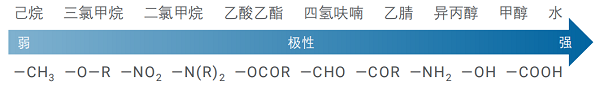 液相色譜顧名思義要使用液體作為載體,這些液體就是我們常用的溶劑,常見的溶劑有以下幾種,極性由弱到強。在液相色譜分析中有一個最基本的要求就是化合物必須能溶于所使用的溶劑,所以在開發(fā)方法之前,我們要根據(jù)現(xiàn)有化合物的一些官能團,來查看或者推測它的溶解性,來找到能夠溶解目標化合物的溶劑。
