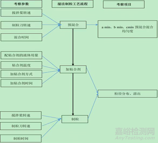圖1:濕法混合制粒工藝流程、考察參數(shù)、考察項目
